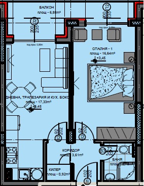 - Хол/всекидневна с кухненски бокс с излаз на тераса