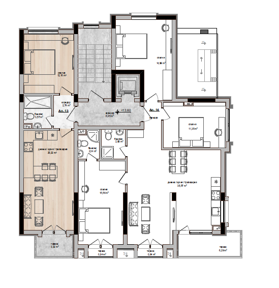 - Просторна дневна с кухненски бокс и излаз към тераса