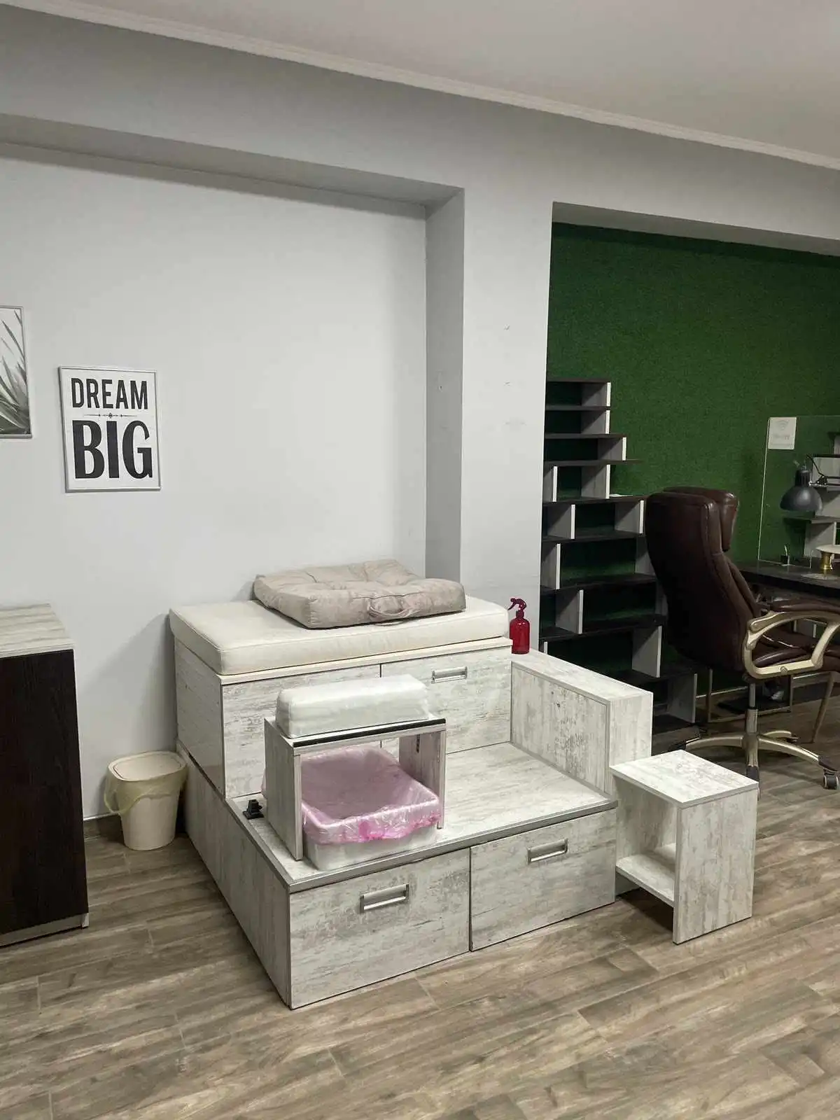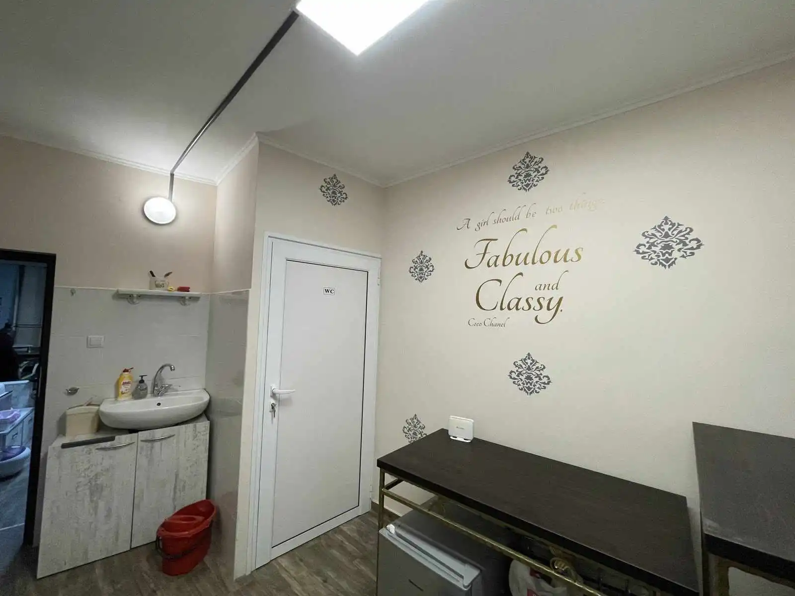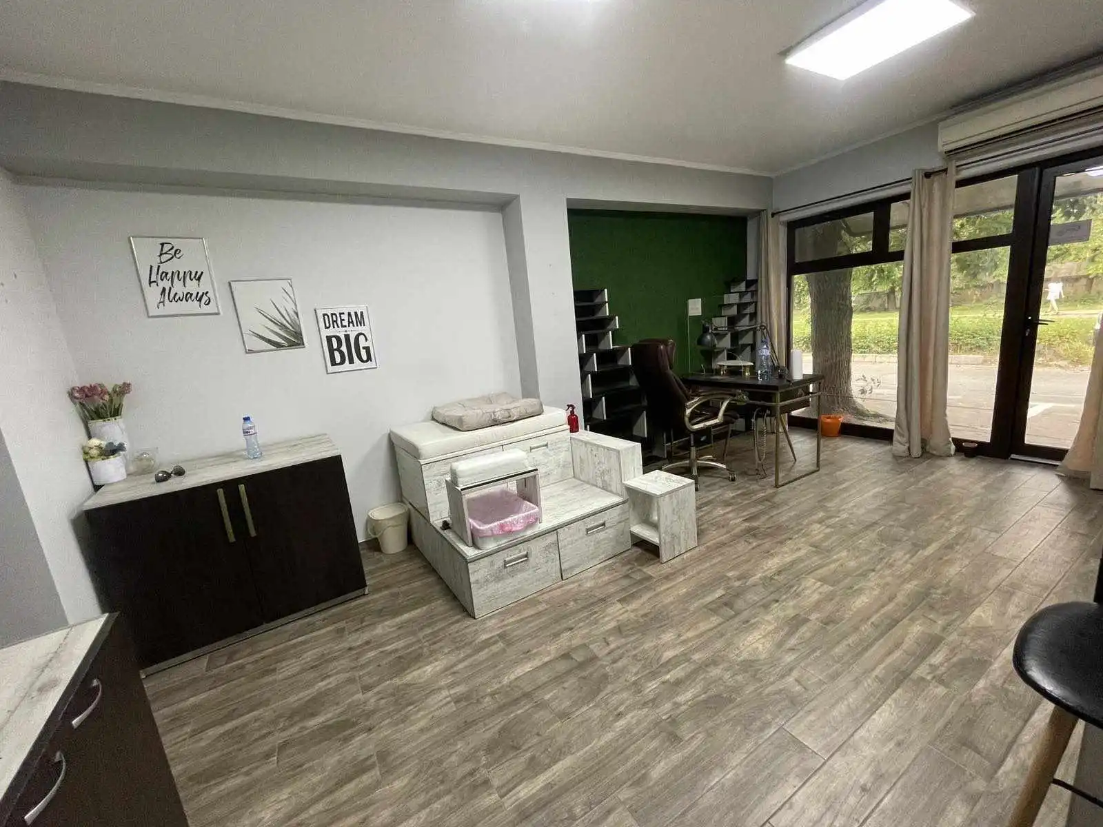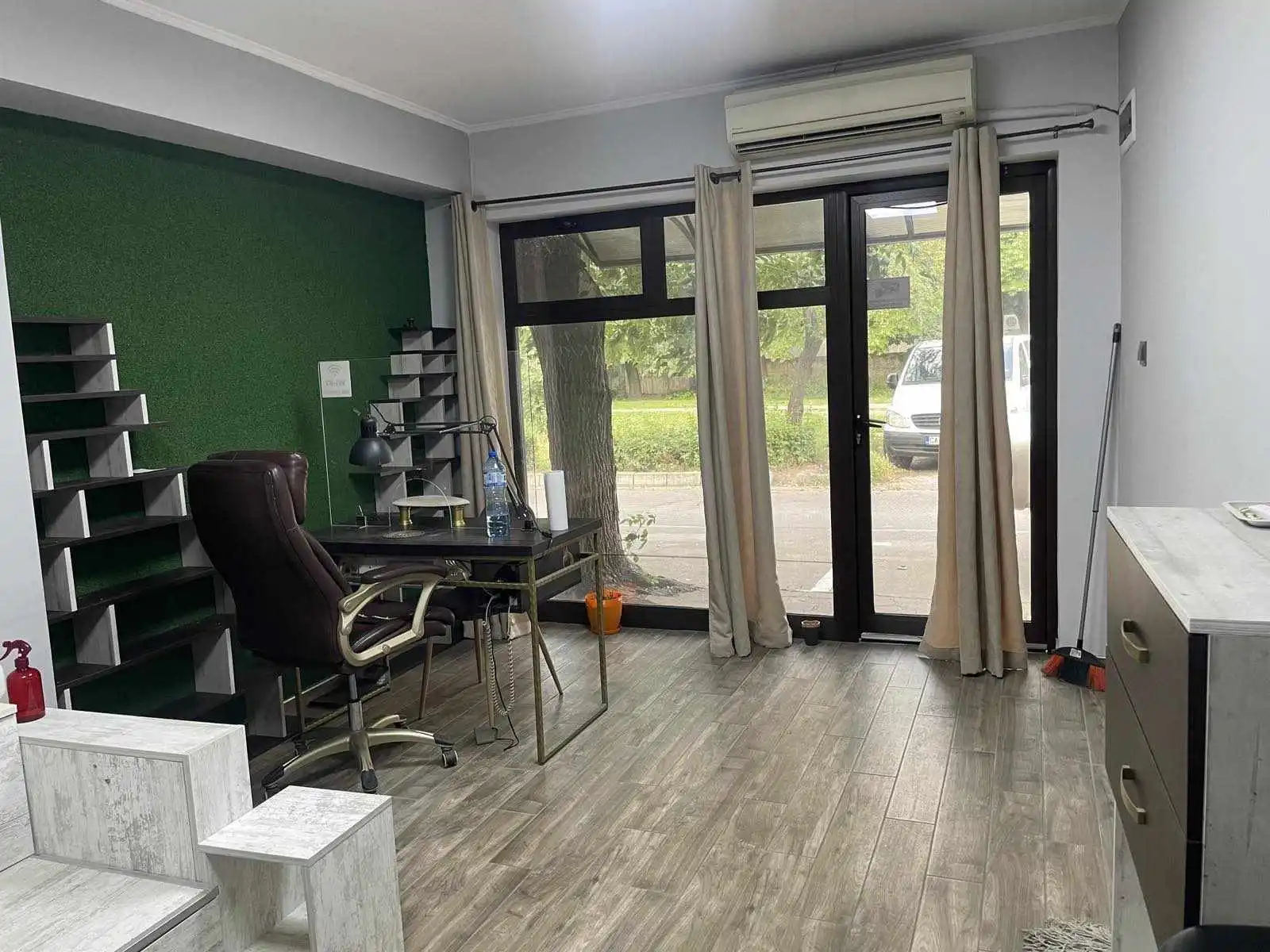 Предлагаме на вашето внимание обзаведен и разработен салон за красота на партерен етаж с площ 35кв.м. състоящо се от 2 преходни помещения. Състоянието е много добро с мебели по поръчка от дърво и ковано желязо – броя бюра-единият от който е с вграден професионален прахоуловител Aero Tech,1 брой бар маса, 1 брой ниска маса, 2 броя щъркели, 4 броя шкафове, 2 броя етажерки, 1 брой педикюрна станция и др., климатик Daikin, телевизор Philips, бойлер Матев, камера с постоянно видеонаблюдение, 2 броя мивки, 1 брой санитарен възел и др.