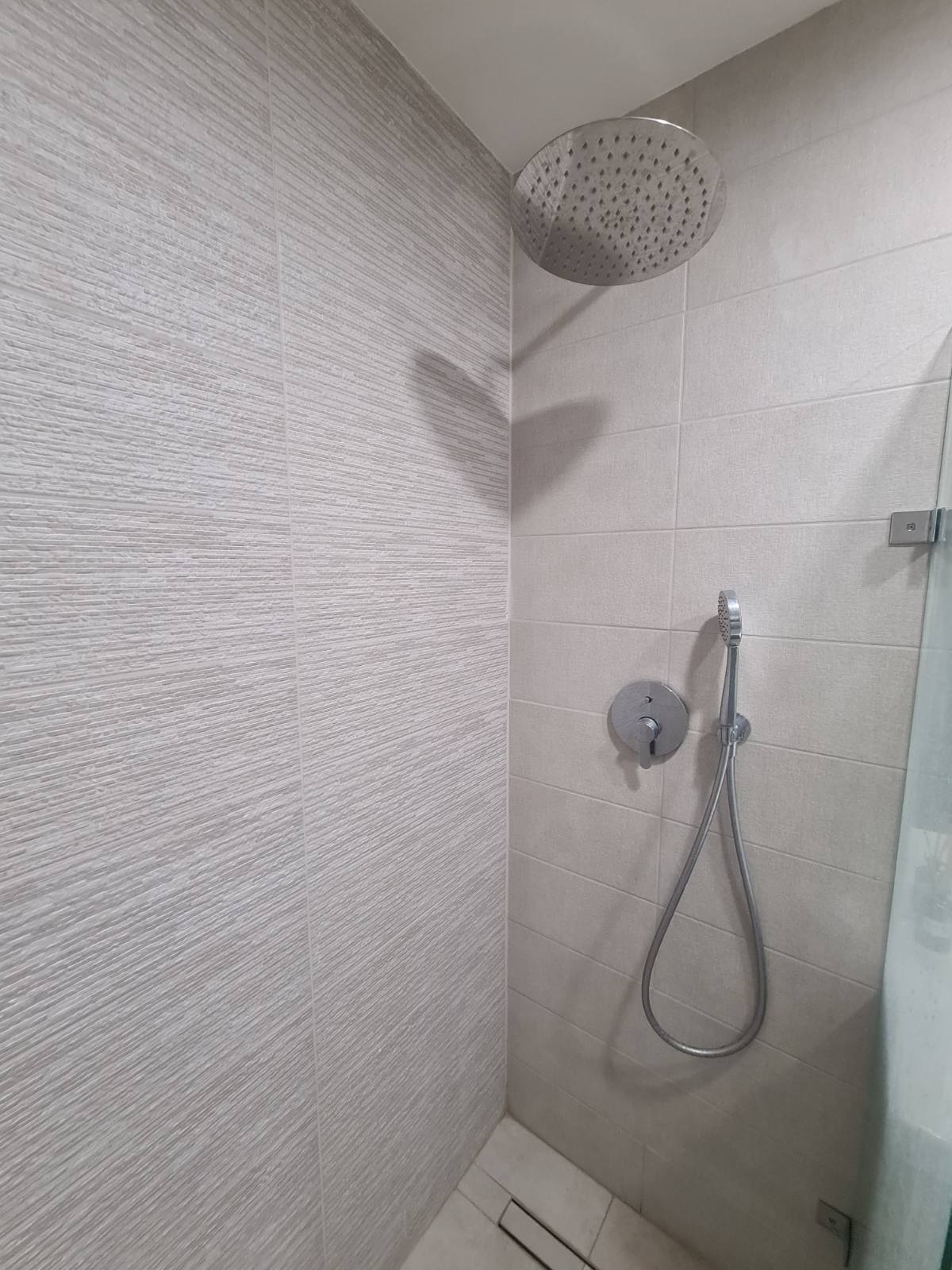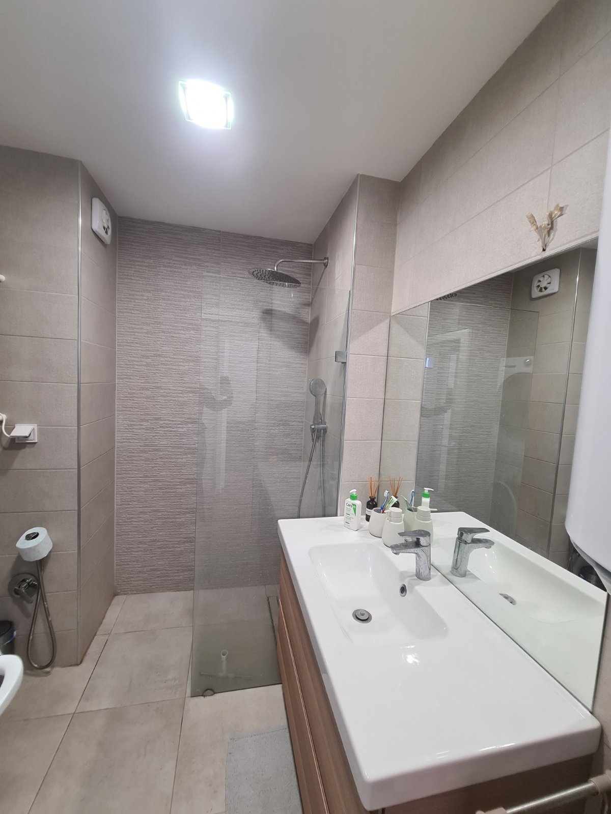 - Баня с тоалетна, модерно оборудвана с душ зона и стъклена преграда